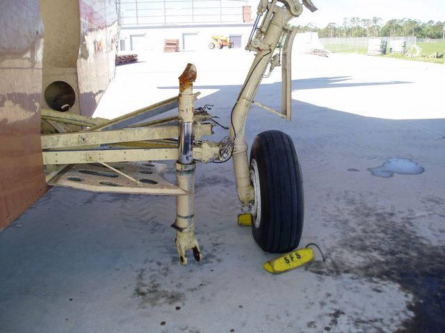 Katanga left gear showing broken right upper gear leg, overload failure when hangar beam fell on the aircraft