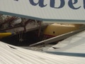 Katanga left gear showing broken right upper gear leg, overload failure when hangar beam fell on the aircraft